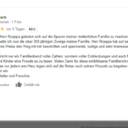 “I asked Mr. Rzeppa to trace my maternal family history. Now I hold in my hands the over 300-year-old branches of my family tree. Mr. Rzeppa has accompanied me on this journey with great sensitivity, adding exciting, funny, and very interesting texts.