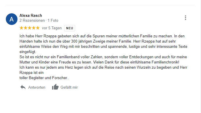 “We commissioned Mr. Rzeppa to create a family tree. Mr. Rzeppa succeeded in researching 300 years of our family history. He not only identified the names and dates of our ancestors, but also uncovered many interesting details (illegitimate children, religious peculiarities, unhappy marriages, old job titles). Mr. Rzeppa takes a strictly scientific approach, communicated with us throughout the research phase, and shared new findings with us. He is always transparent in the services he provides and offers them at a fair price. We can recommend him without reservation.”